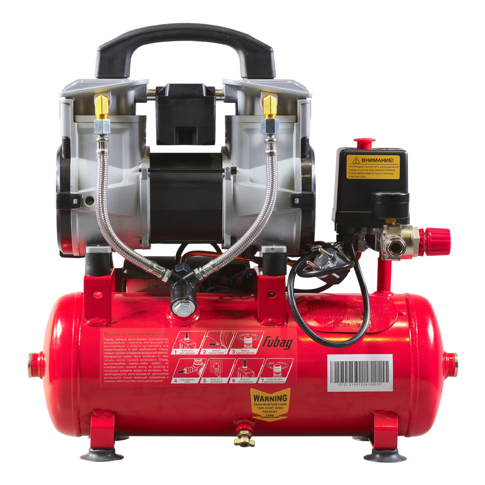 Все ресиверы компрессоров FUBAG протестированы на максимальное давление по стандарту СЕ, что гарантирует безопасность их использования. Давление, температура эксплуатации, толщина стенок ресивера и его объем указаны на заводской табличке, приваренной к корпусу ресивера, подтверждающей его соответствие европейским стандартам качества.