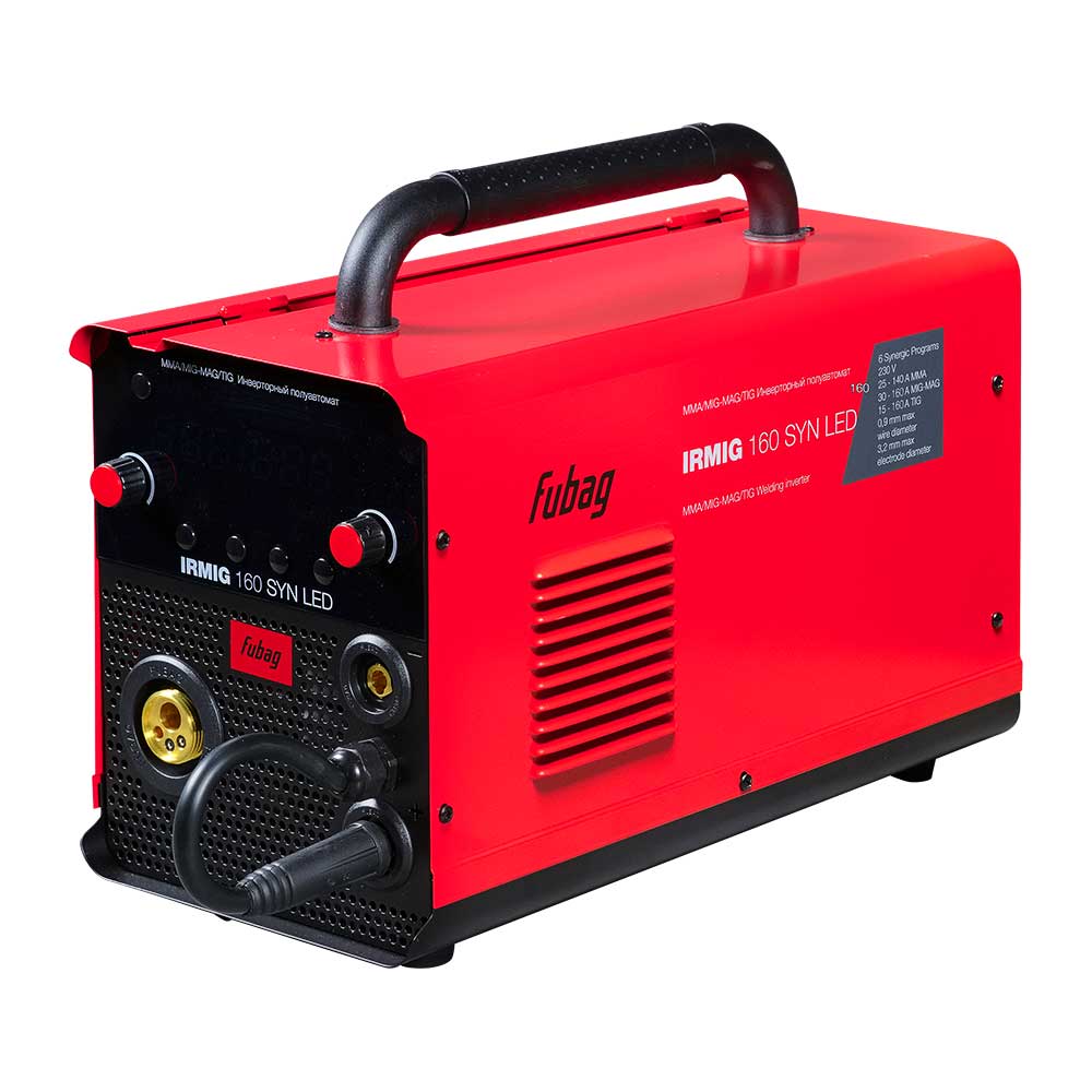 Передняя панель оснащена LED-дисплеем, регуляторами силы тока и скорости подачи проволоки, что позволяет быстро и просто выбирать режимы и оптимальные параметры сварки. Оснащен евроразъемом (Euro) для быстрого и безопасного подключения сварочной горелки. При покупке сварочного инвертора IRMIG 160 SYN LED вы получите в коробке фирменную горелку Fubag на 150 А и газовый шланг, а также кабель с электрододержателем и кабель заземления. Продолжительность включения (ПВ) составляет 20% при 40°С (в соответствии с европейским стандартом EN60974-1). Сварочный полуавтомат Fubag IRMIG 160 SYN LED обладает легкой сменой полярности для работы с самозащитной проволокой. Эффективная система охлаждения, а также встроенная функция термозащиты с индикацией перегрева гарантируют долговечность и надежность использования аппарата в условиях интенсивной эксплуатации. Все технические характеристики наглядно и подробно указаны на корпусе аппарата.