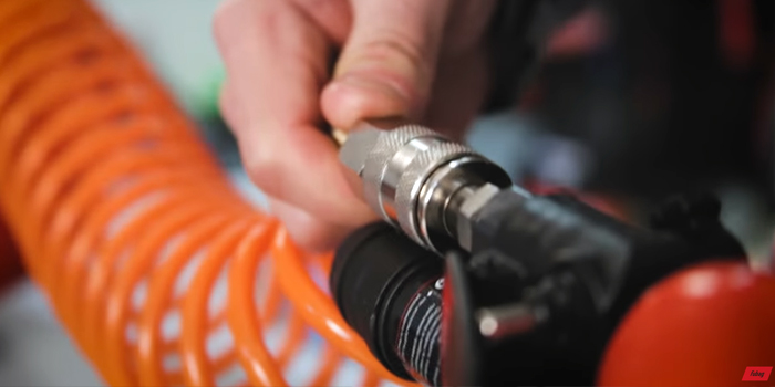 2. Крепим к воздушный шланг к компрессору и рабочему инструменту.